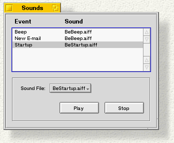 The Sounds preferences application is where you set system sounds. Currently, you can set the sound for three events: The general system Beep, the arrival of a New E-mail notification, and the system Startup sound.