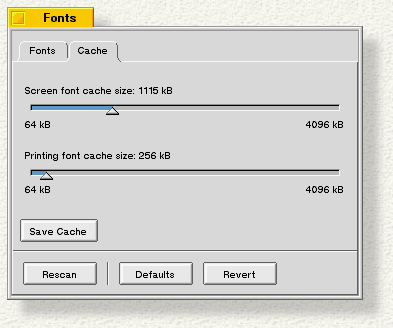 Fonts lets you set the system fonts and the size of the font caches. There are three types of system fonts: plain, bold, and fixed-spaced. Individual fonts have additional popups that let you choose among style options available for that font. You can set the size, from 9 to 12 points, with the Size: popup.